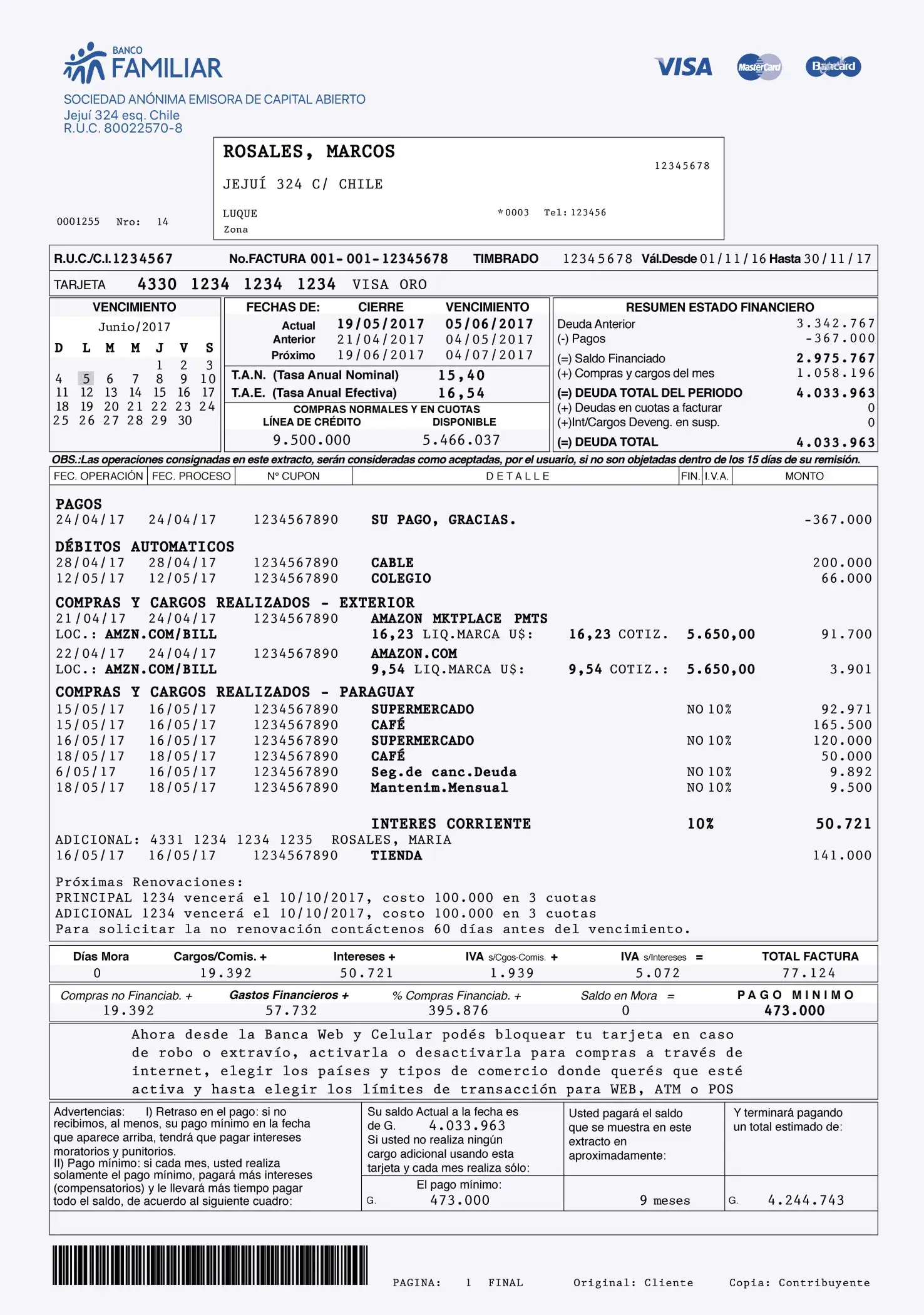 Aprendé más acerca del extracto de tu tarjeta de crédito Familiar. Hacé clic en cualquiera de los puntos sobre el ejemplo para obtener más información.